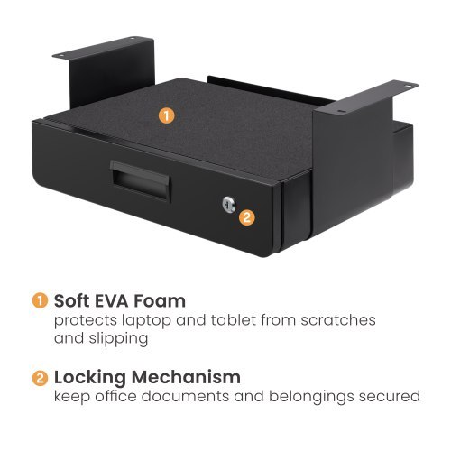 DODATKOWA SZUFLADA ZAMYKANA BIKETEC Idealna do warsztatu i kampera. Dodatkowe miejsce na prywatne lub niezbędę rzeczy, które najlepiej mieć pod ręką. Oszczędzająca miejsce szuflada pod biurkiem z półką i mechanizmem blokującym Opis: Szuflada Biketec to jedno z najbardziej przystępnych cenowo i praktycznych rozwiązań dla dodawania przestrzeni do przechowywania w obrębie istniejących stanowisk. Nasza szuflada zapewnia łatwy dostęp do ołówków, telefonów, tabletów, dokumentów i innych często używanych przedmiotów. Solidna stalowa konstrukcja z zaokrąglonymi krawędziami i narożnikami dla większego komfortu i bezpieczeństwa. Ochronna pianka EVA na półce chroni urządzenia przed zarysowaniami i zapobiega ślizganiu się. Płynny mechanizm przesuwania cicho otwiera i zamyka szufladę, idealny do środowisk biurowych. Mechanizm blokujący zabezpiecza dokumenty i rzeczy osobiste w biurze. Łatwa instalacja dla użytkownika