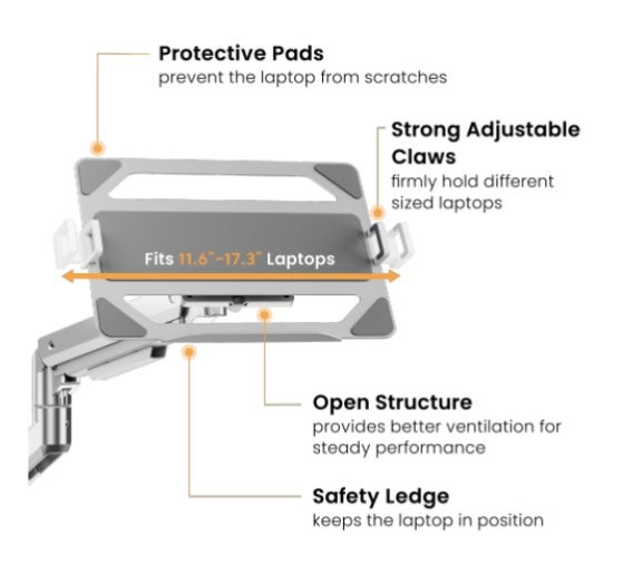 Uniwersalny stalowy uchwyt na laptopa do ramion monitora Do większości laptopów 11,6"-17,3" Opis Ten uchwyt na laptopa umożliwia montaż na ramieniu monitora, aby podnieść laptopa i zapewnić ergonomiczne i zorganizowane środowisko pracy. Dzięki regulowanym pazurom i listwie zabezpieczającej może on pewnie zamocować ekran na wysokości oczu, co poprawia postawę i zmniejsza obciążenie szyi i oczu. Co więcej, otwory na kable zaprojektowane na pazurach zapewniają dostępność i utrzymują uporządkowany wygląd.